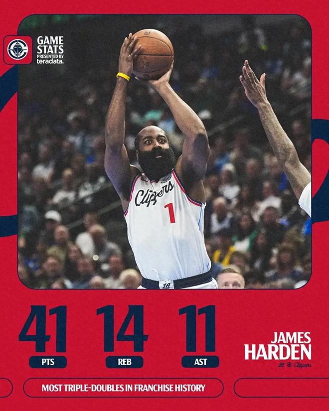 快船加时以微弱优势击败独行侠,艰难拿下本场比赛的胜利。然而,这场来之不易的胜仗并未能掩盖快船队新赛季开局的惨淡战绩——截至目前,号称航空母舰的他们的成绩仅为4胜8负,排名西部倒数第三。球队的核心哈登在本场比赛中爆发,成为快船队史首位单场砍下40+三双的球员,他贡献了41分、14篮板、11助攻,外加1抢断和2盖帽的全面数据。哈登的出色表现堪称“续命神针”,但也暴露了快船队当前的窘境:伦纳德因伤迟迟无法复出,比尔赛季报销,球队几乎完全依赖哈登一人扛起进攻大旗。